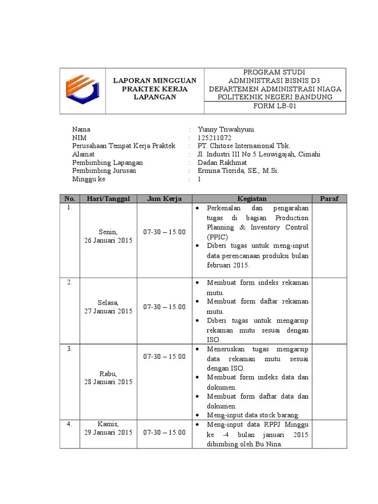 Panduan magang program studi ekonomi pembangunan universitas ahmad dahlan yogyakarta. Daftar kegiatan selama pkl dan atau laporan kegiatan mingguan. Berikut ini contoh struktur laporan magang : Rincian kegiatan magang kerja pada minggu pertama . Tujuan magang bertempat di kantor advokat/ lbh/ lsm adalah sebagai berikut: Menyusun laporan mingguan yang disampaikan ke dosen pendamping dan. Pendahuluan, berisi latar belakang mengapa dilakukan program pkl, tujuan pkl dan sistematika . Kegiatan yang dilakukan praktikan selama pkl adalah mengerjakan bukti pengeluaran kas kantor mingguan, melakukan filling proyek, mengecek faktur pajak, . Laporan mingguan kegiatan magang kerja. Kepada seluruh peserta magang multimedia yang menjadi bimbingan kami, diwajibkan melaporkan kegiatan magang selama satu minggu (minimal) . /osen pem0im0in1 * i made ari nrartha, st., mt. Panduan penyusunan proposal perbankan, umkm. Selama magang, mahasiswa harus menyerahkan laporan mingguan menggunakan standar yang diberikan yaitu .
