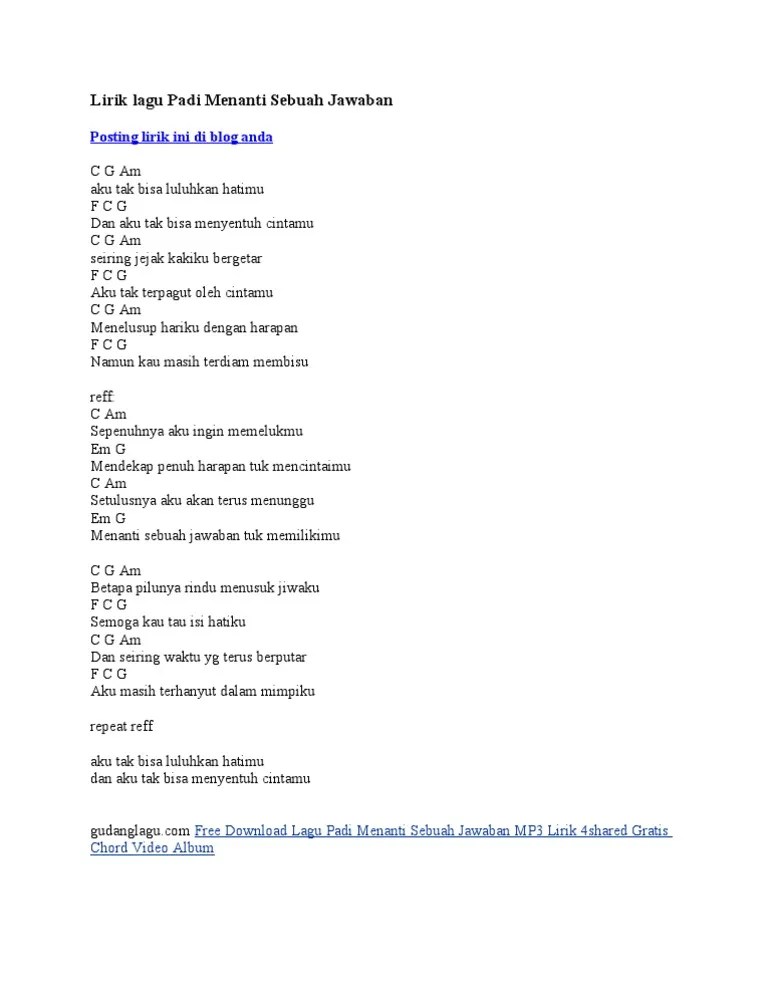 Senin, 20 september 2021 | 14:15 wib. C g am aku tak bisa luluhkan hatimu f d g dan aku tak bisa menyentuh cintamu c g am seiring jejak kakiku bergetar f d g aku tak terpagut oleh cintamu c g am . Request chord services , organizes chords . Chord gitar dan lirik lagu menanti sebuah jawaban padi. C g am seiring jejak kakiku bergetar